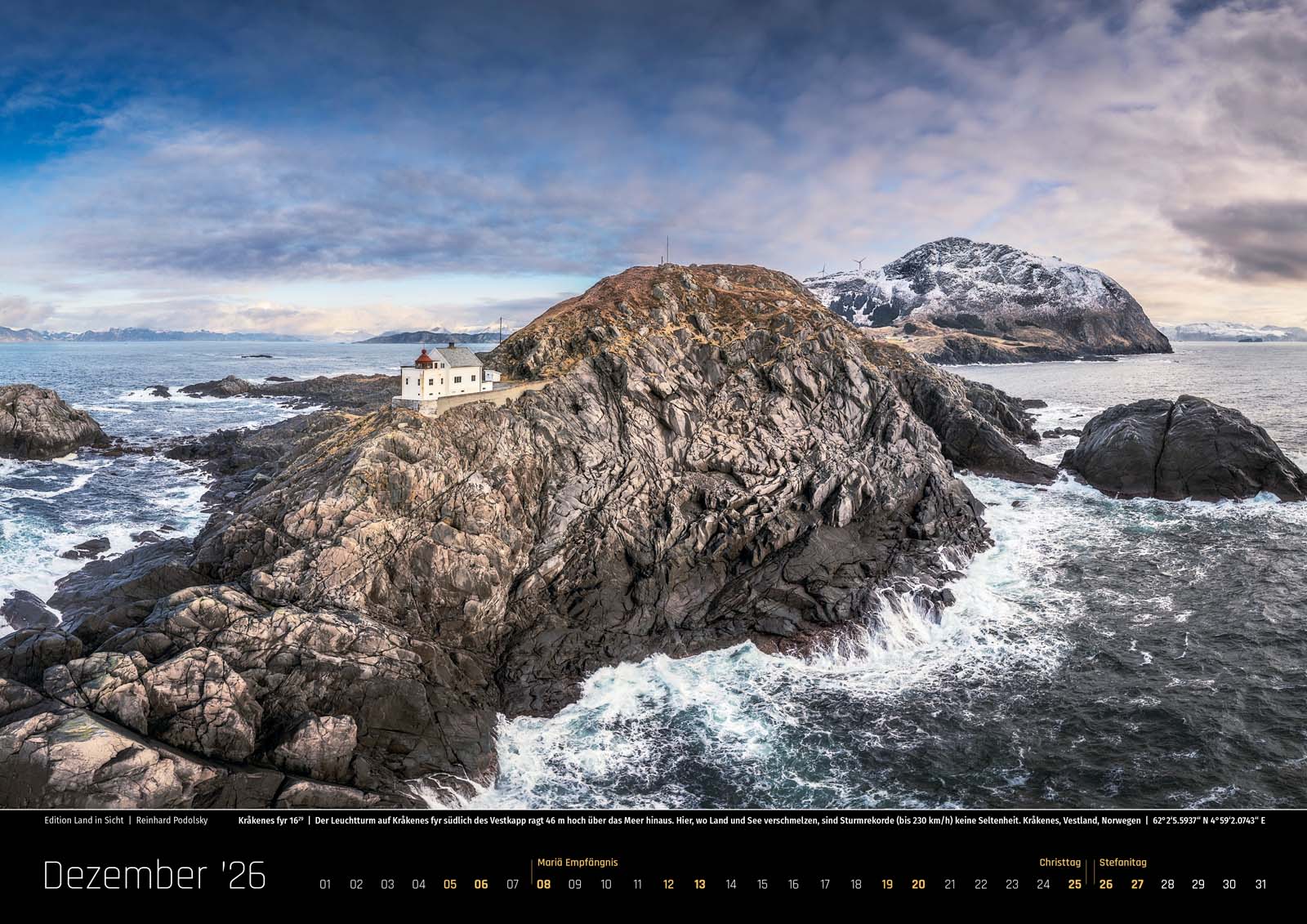 „Landschafft! Norwind“ erzählt in zwölf Monaten die Geschichte vom berüchtigten Vestkapp, an dem drei Meere aufeinandertreffen, gemeinsam an das steile Rückgrat Norwegens branden und ein eigensinniges Kind aus Land und Meer zeugen …