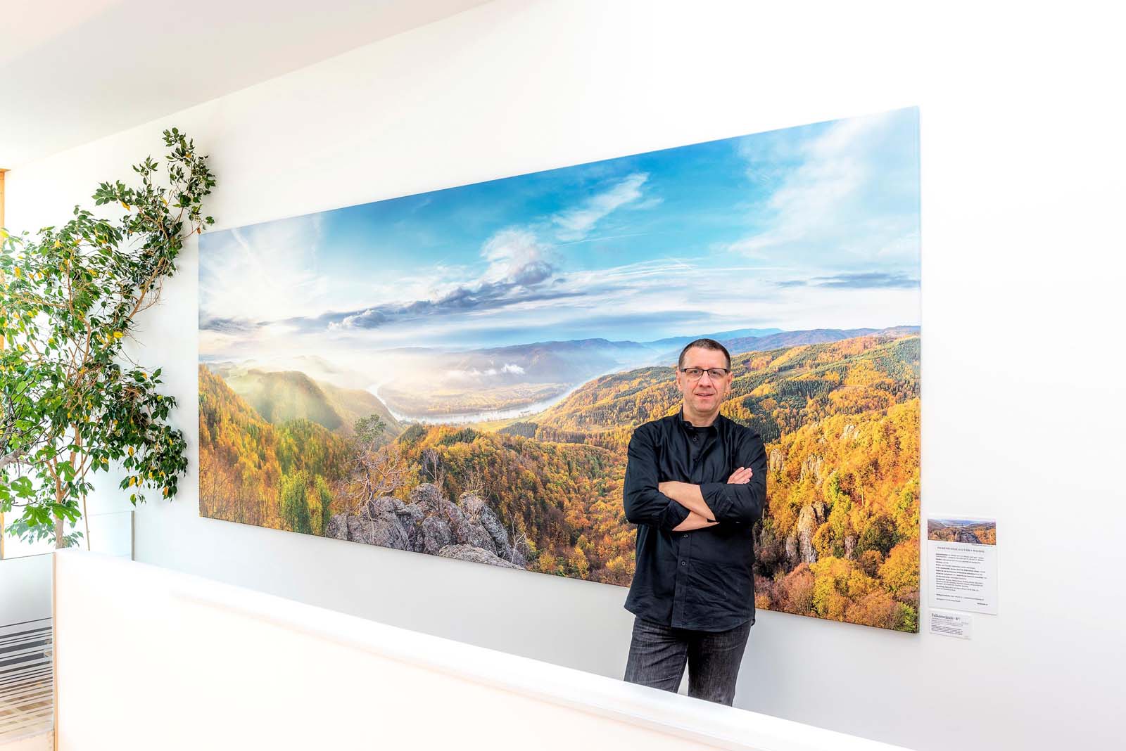 Niederösterreichs größte Ausstellung von XXL-Landschaftsportraits öffnet ihre Tore für die Tage der offenen Ateliers. Mit intensiven Fotografieportraits, die bis zu sechs Meter Länge (!) erreichen und aus mehr als 100 Aufnahmen bestehen, hat sich der auf Großformate spezialisierte Landschaftsfotograf Reinhard Podolsky spannenden Motiven aus Land und Meer gewidmet. Auch das Wald- und Weinviertel mit Wasser-, Stein- und Waldkombinationen kommt nicht zu kurz: Im Gegenteil – auf viereinhalb Metern Länge deckt das XXL-Portrait der Wachau 60 Kilometer Luftlinie ab.